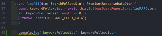 일단 코드를 간략하게 설명하면 dto를 파라미터로 받아서 해당 repository에서 검색후 결과가 없을경우 에러처리를 해주는 부분이다.