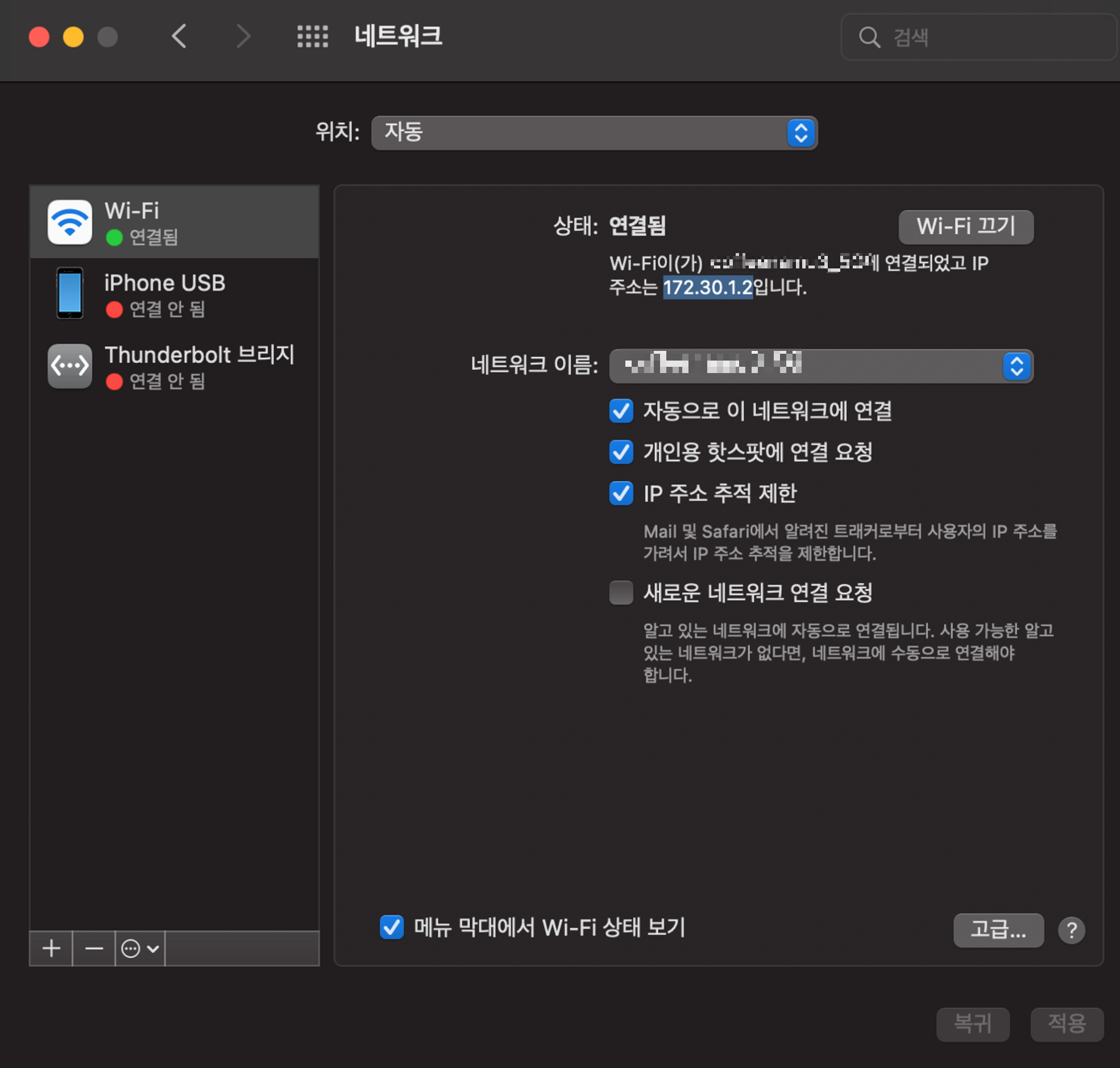전에 내IP 말고 사용자지정 누르고 맥 네트워크 설정에 있는 IP 주소를 넣었다가 안된적이 있었다.