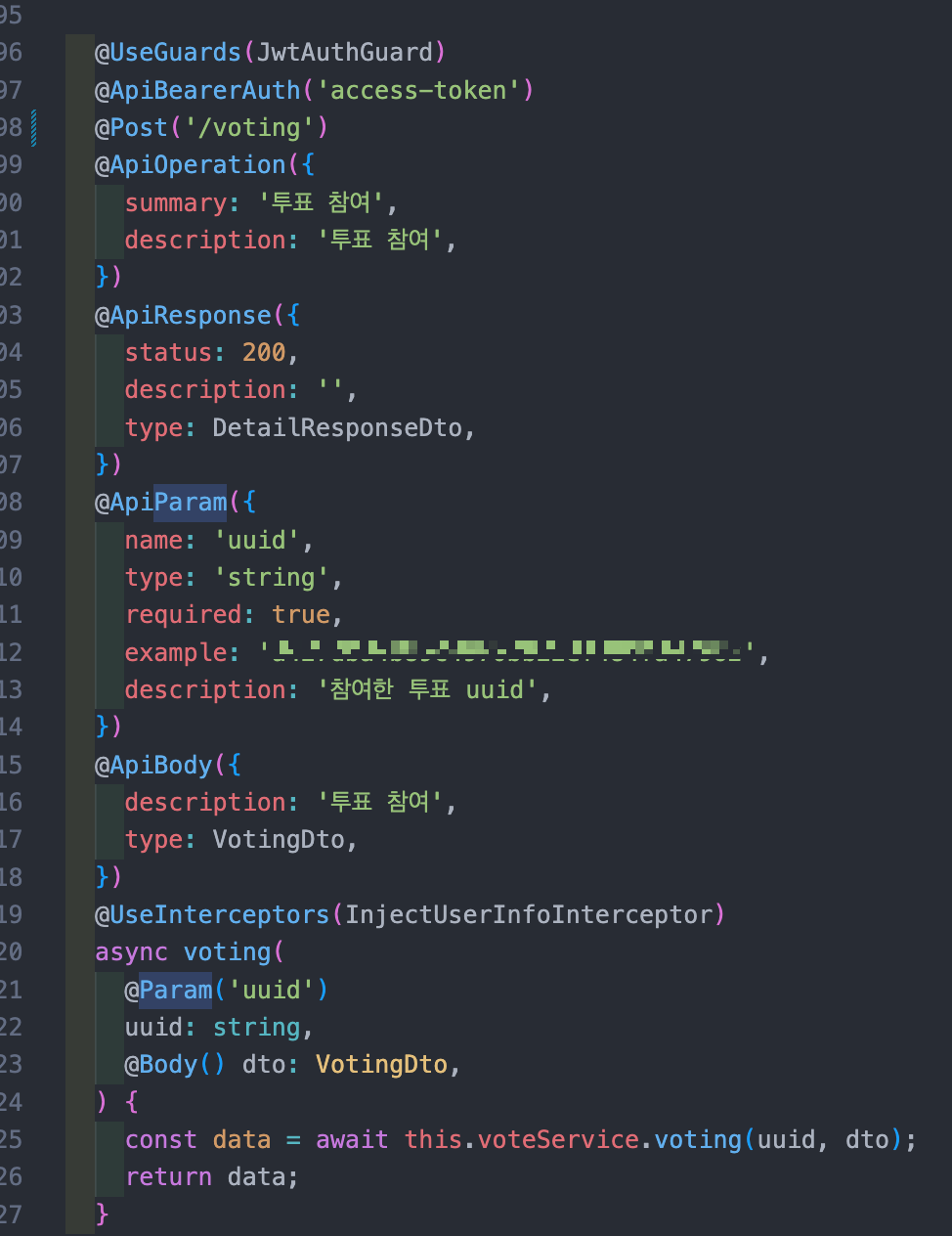 해당코드를 보면 Controller에서 @Param('uuid')과 @Body() 로 파라미터를 service부 한테 넘겨주고 있는 코드다.