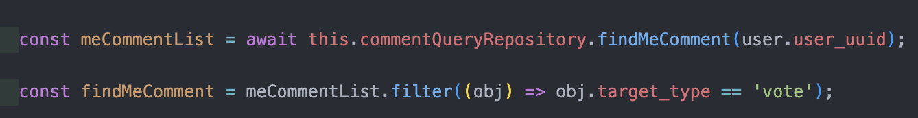 "meCommentList"라는 배열의 각 객체의 target_type의 Value값이 "vote"인 객체를 전부 뽑는 역할을 한다.