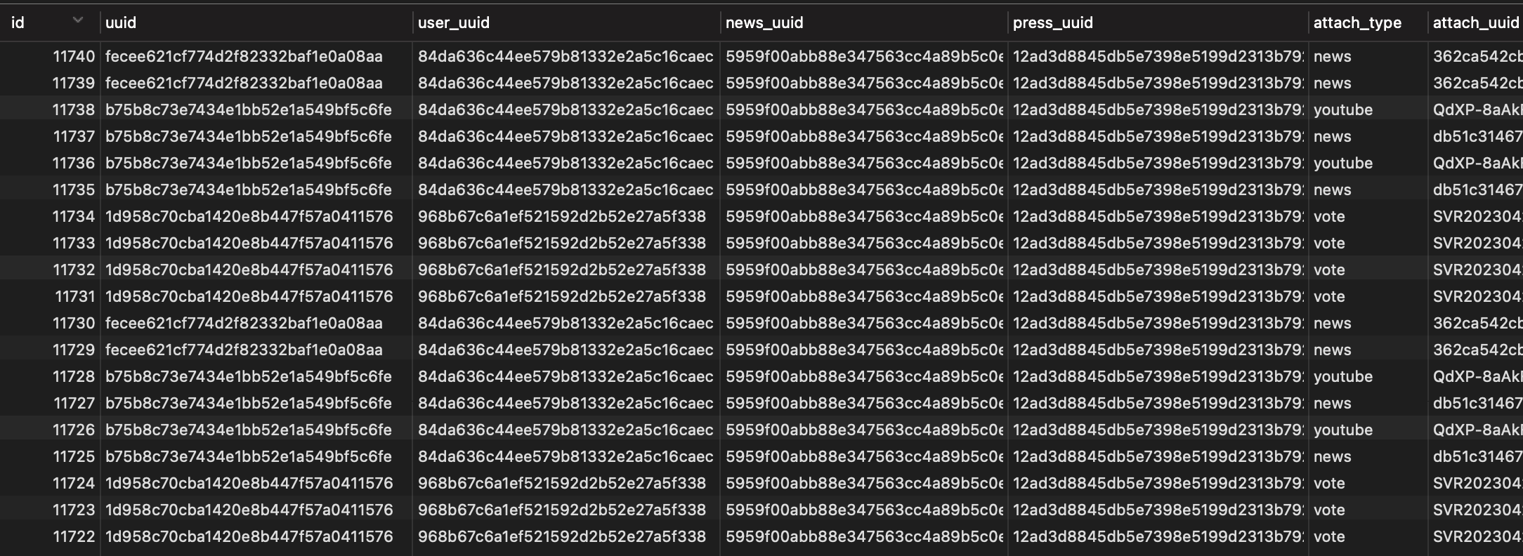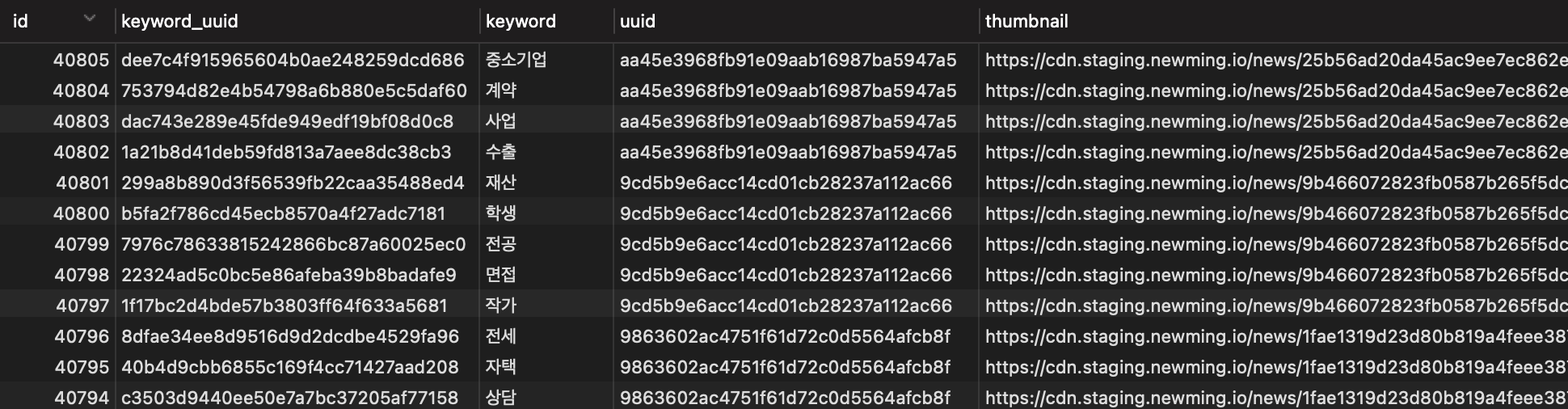 뉴스의 키워드 정보를 한 개의 uuid로우에 여러 키워드를 담고 싶었다.