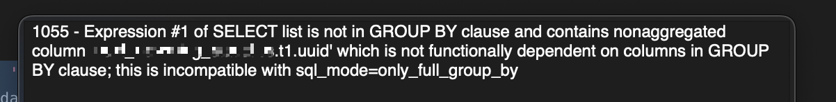 1055 - Expression #1 of SELECT list is not in GROUP BY clause and contains nonaggregated column 'next_newming_statistics.t1.uuid' which is not functionally dependent on columns in GROUP BY clause; this is incompatible with sql_mode=only_full_group_by