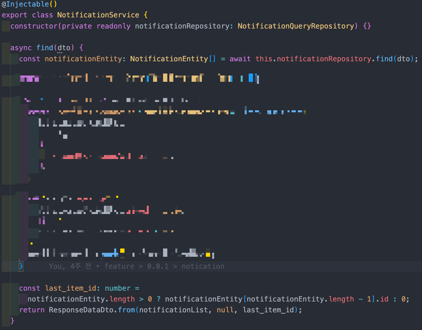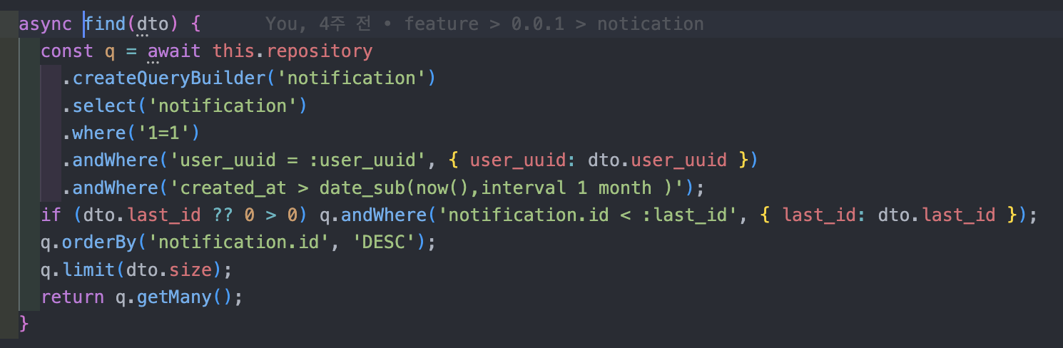 변수 notificationEntity를 선언하고 Repository.find() 로 넘어가보자.