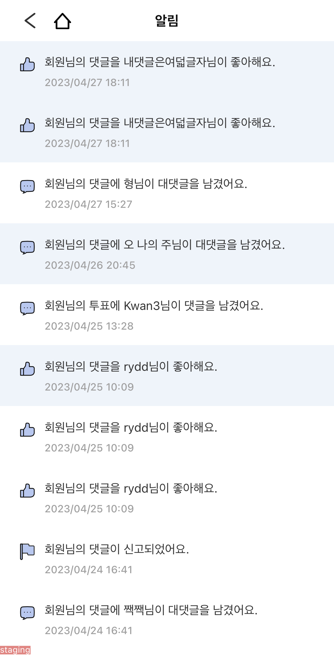 해당 사진은 알림 목록 쪽 사진인데, 아래로 스크롤하면서 10개씩 끊어서 로딩해서 보여주게끔 해준다.