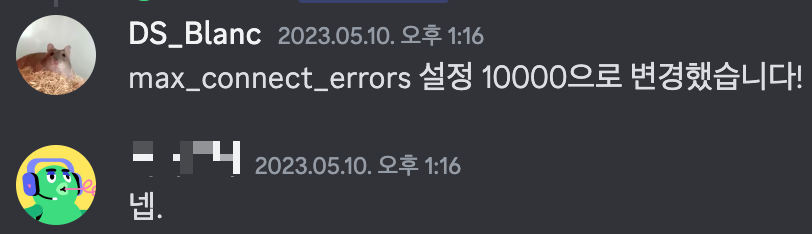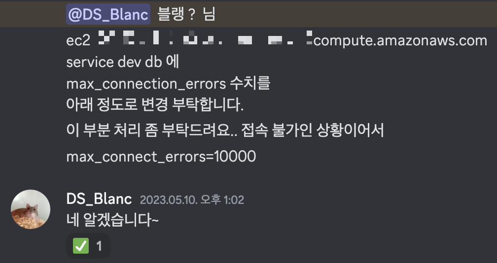 아무튼 이처럼 DB접속이 불가능 하고, max_connection_errors 수치 변경을 요청하셨다.