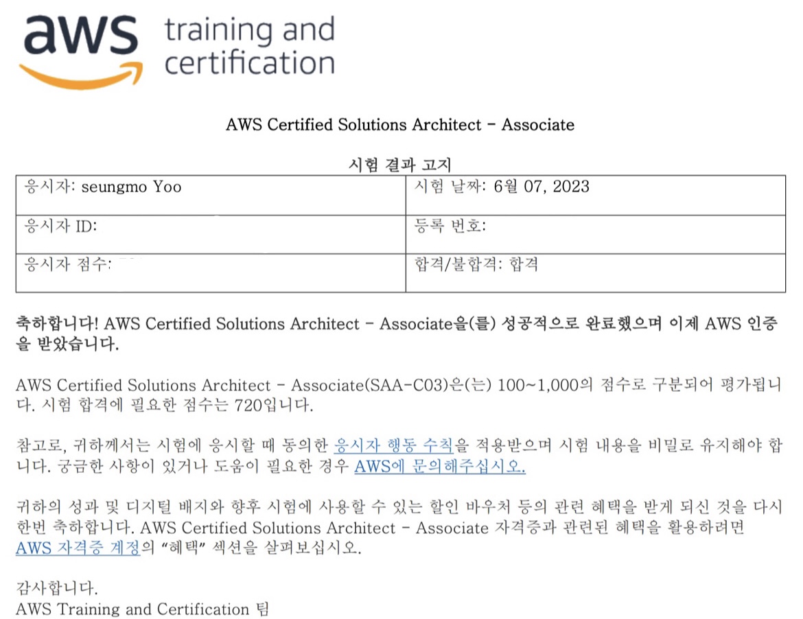 신나는 마음으로 AWS에 들어가 보니 합격문구와 인증서와 점수표를 볼 수 있었다!