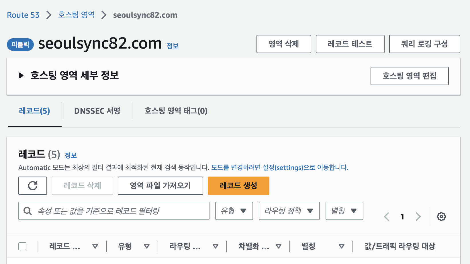 Route53 호스팅 영역에서 레코드 목록을 보면 방금 생성한 항목이 보일 것이다.