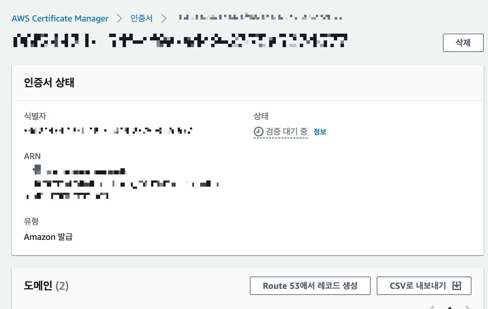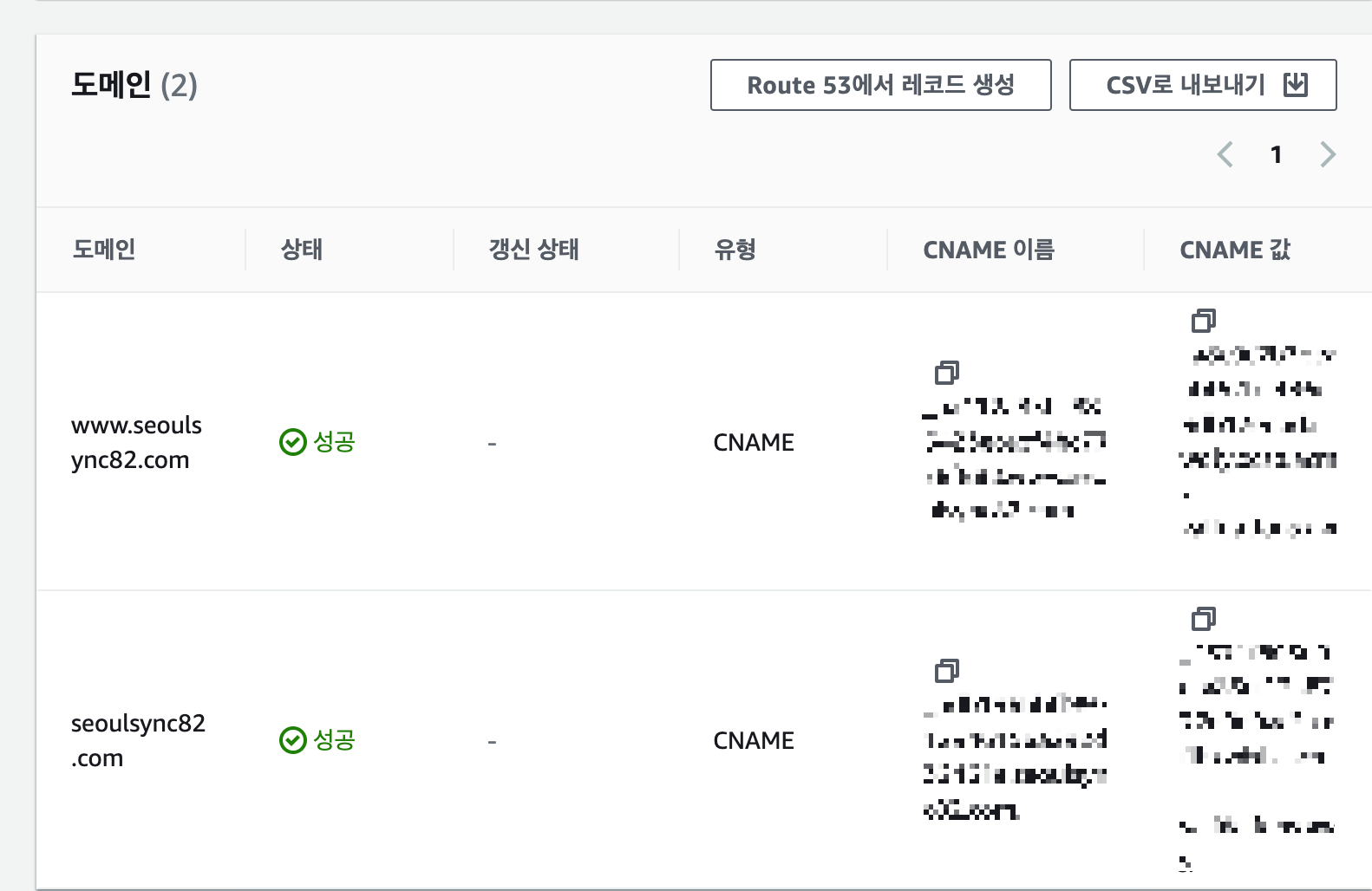 값을 맞춰주었으면 1분정도 안에 다시 ACM->도메인으로 돌아가서 "상태"를 확인해보면 성공으로 변경되었을 것이다.