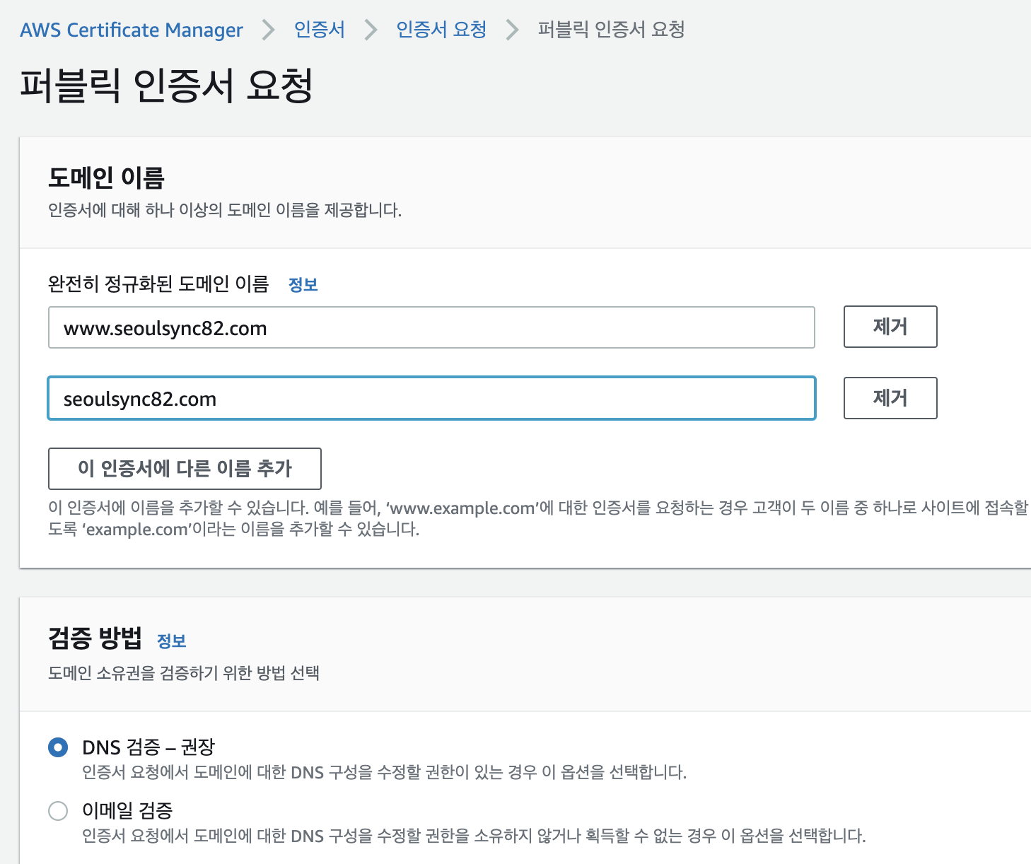 ACM 서비스에 들어가서 인증서 -> 요청을 눌러주자.