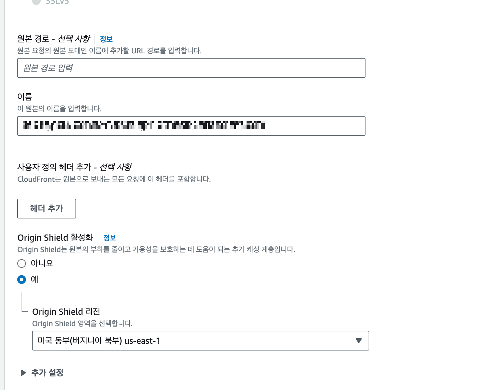 Origin Shield 활성화를 켜주고 버지니아 북부로 해준다.