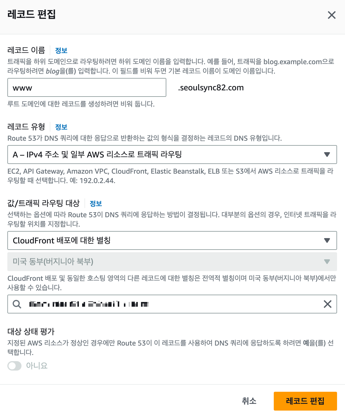 값/트래픽 라우팅 대상은 "CloudFront 배포에 대한 별칭" 으로 해주자.