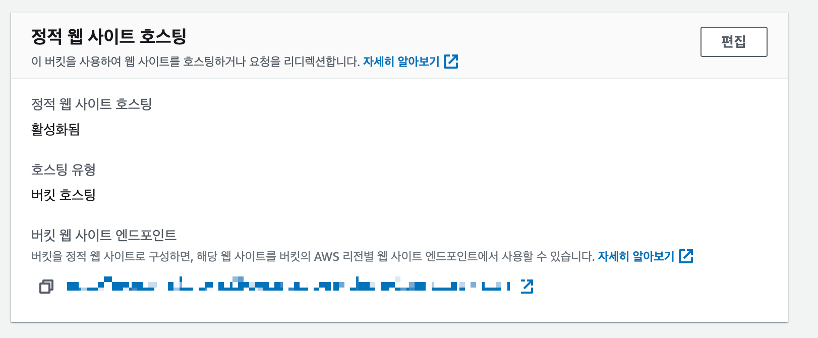 S3 버킷 -> 속성 -> 스크롤 맨 아래 "정적 웹 사이트 호스팅" 의 엔드포인트 복사