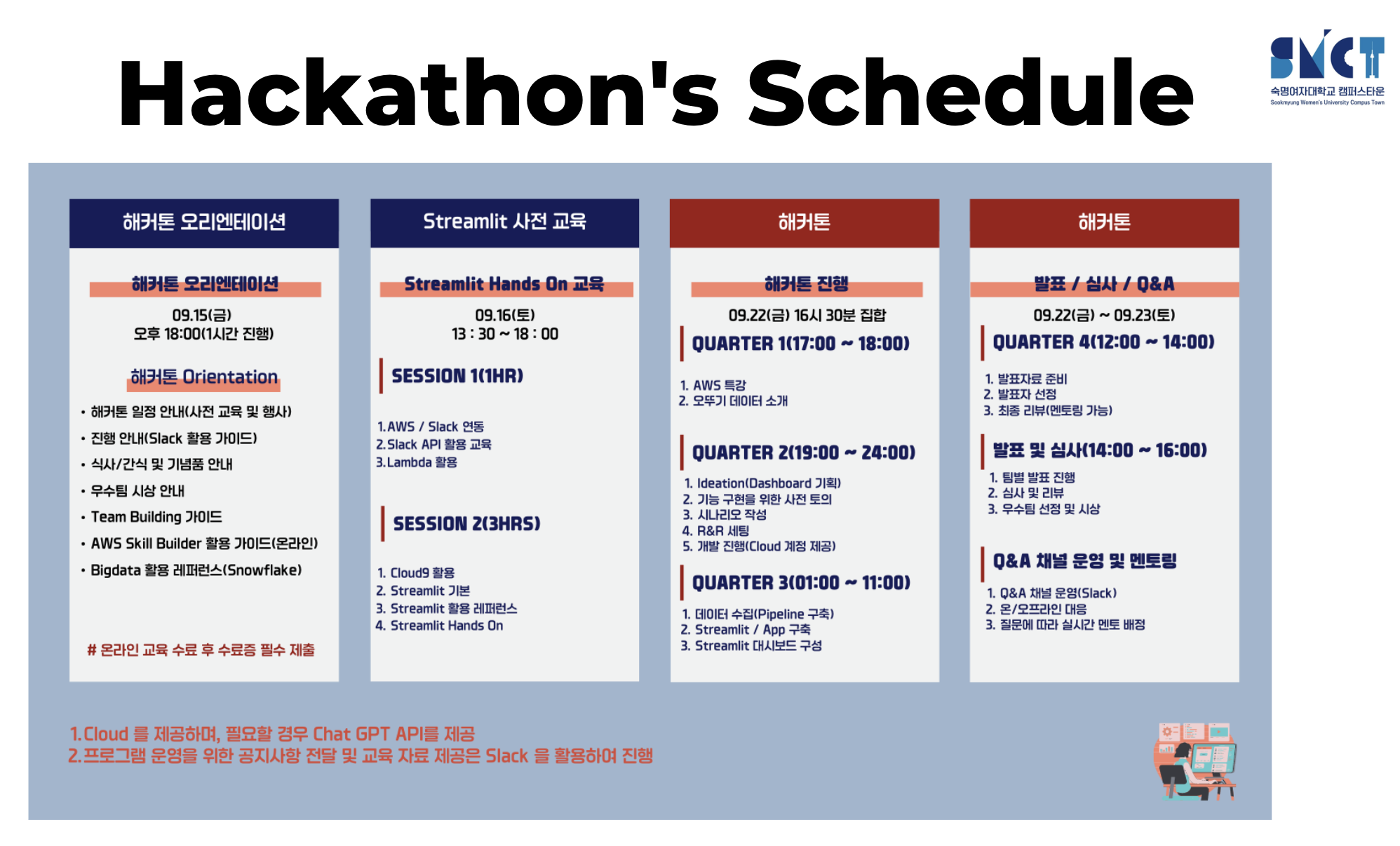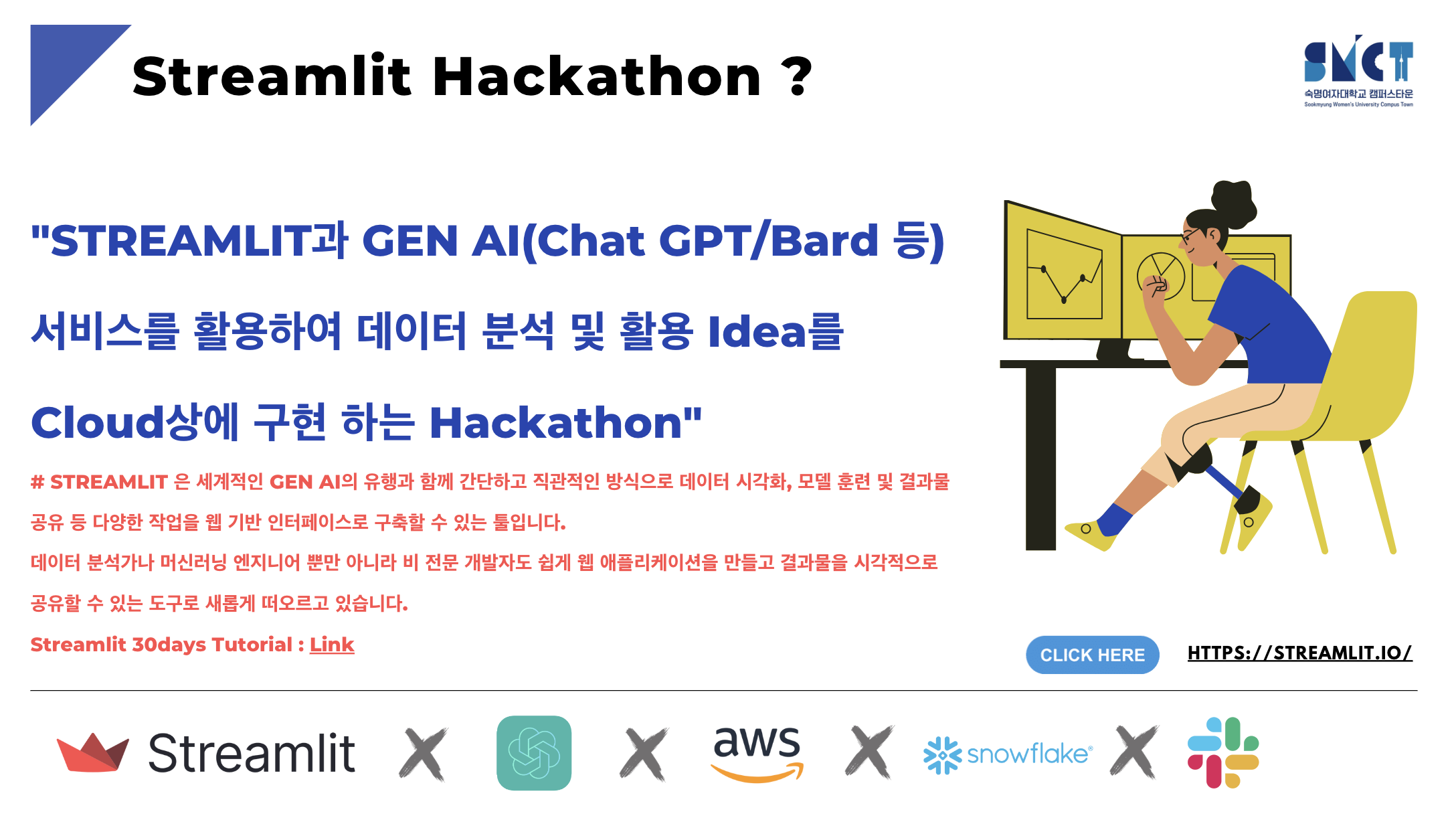 저번주에 숙명여대에서 Bigdata/AI Streamlit 해커톤을 진행했다.