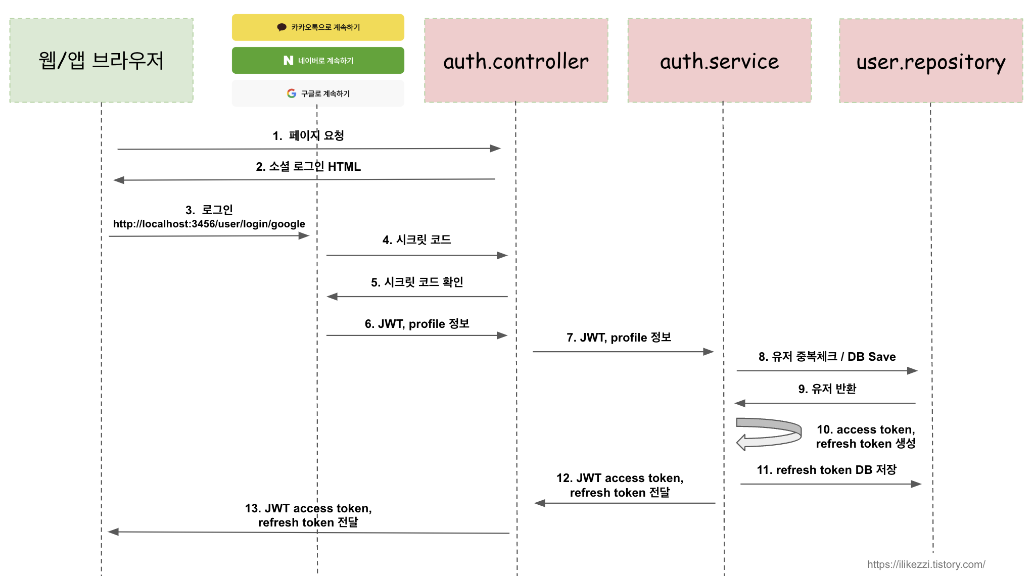 13. controller -> 웹/앱 브라우저: JWT access_token과 refresh_token을 반환한다.