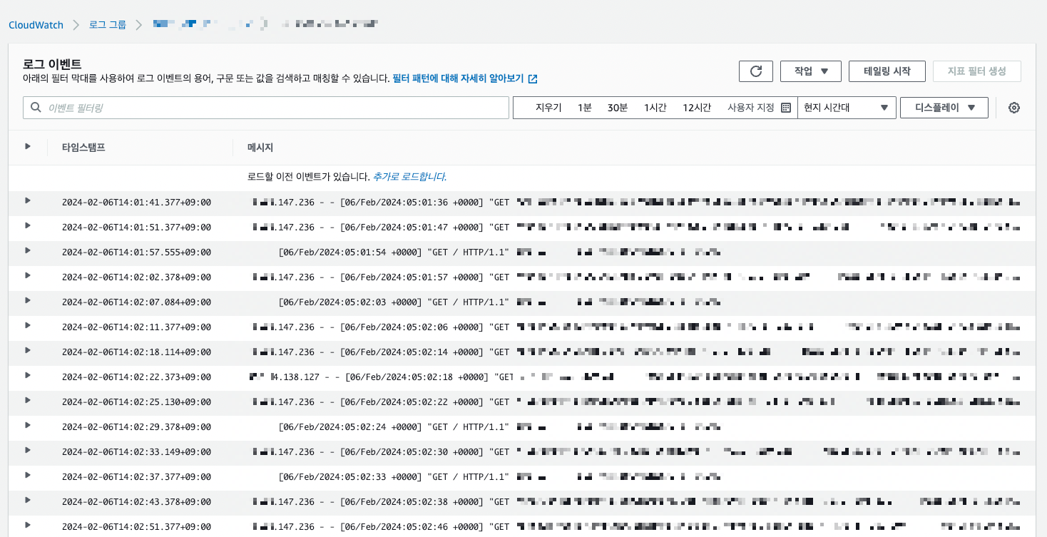 CloudWatch > 로그그룹 > 아까 설정하면서 만든 로그그룹 선택