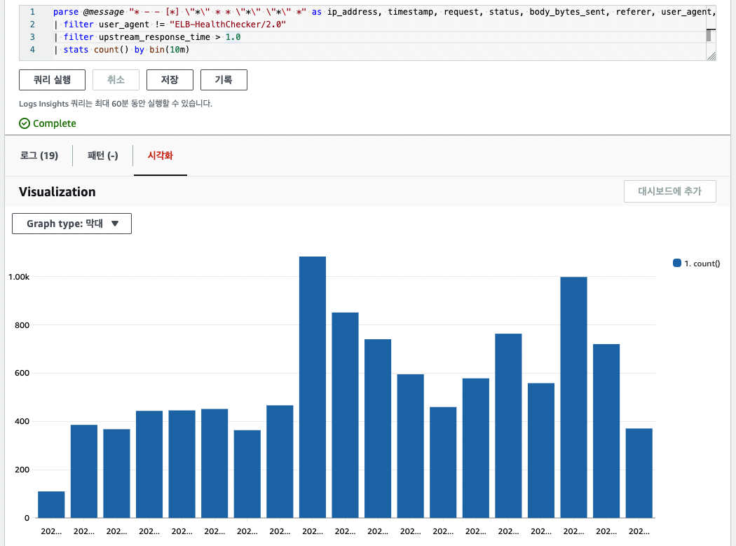 이런식으로 "응답시간 1초를 초과하는 요청 수" 의 합을 막대 그래프로 뽑아서,