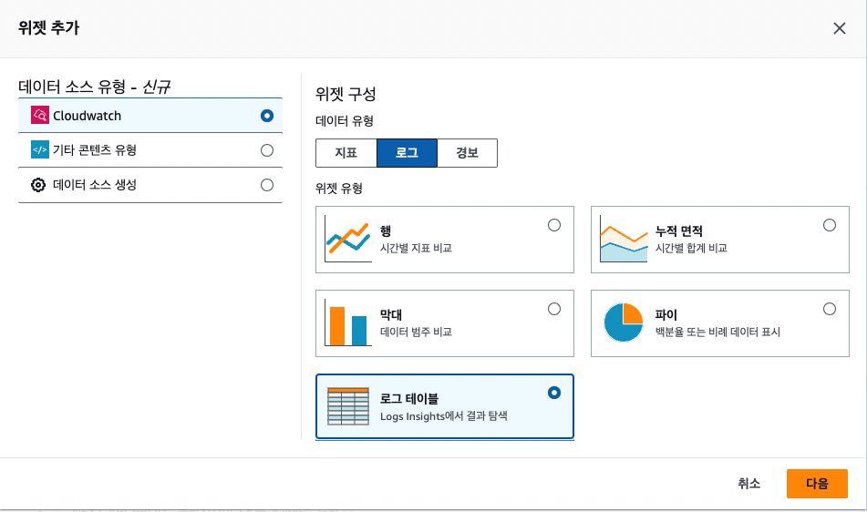 CloudWatch > 대시보드 생성 > "+" 버튼 클릭