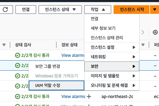 EC2 대시보드에서 인스턴스를 선택하고 작업 -> 보안 -> IAM 역할 수정으로 이동해서 새로 생성한 역할을 선택하면 된다!