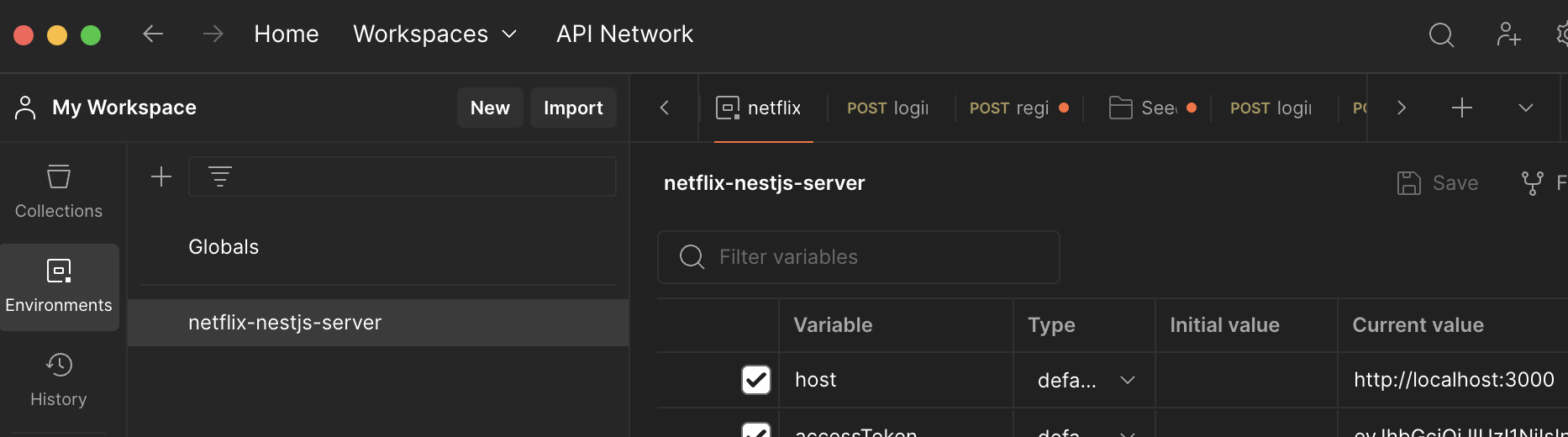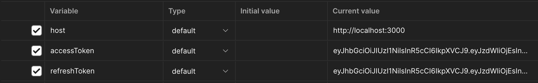 이렇게 만들어두면, API 호출 시 {{host}}가 자동으로 http://localhost:3000으로 대체된다.