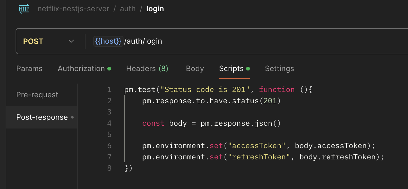 예시로 POST {{host}}/auth/login을 호출했다고 가정했다.