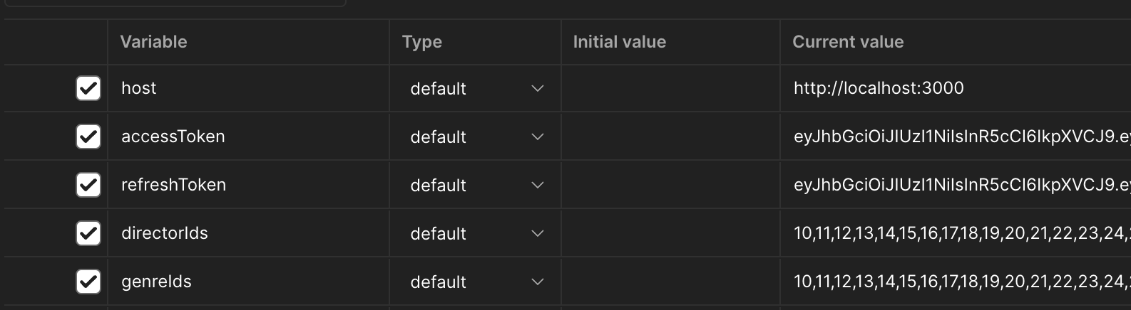 directorId와 genreIds에 아까 쌓은 Postman 환경변수를 사용하도록 설정했다.