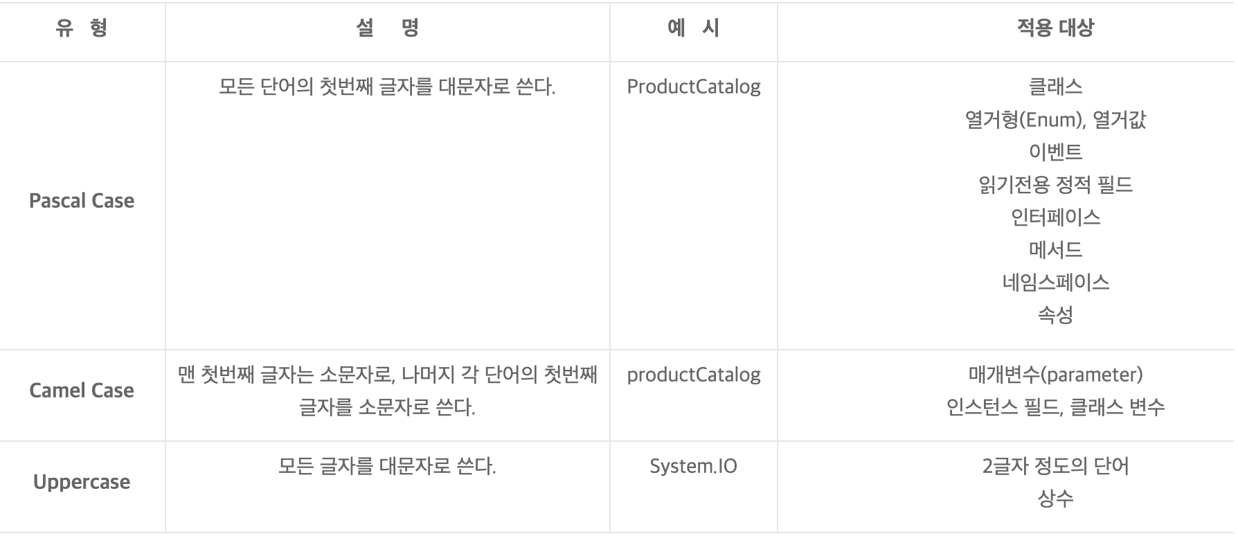 최초에 사용된 단어를 제외한 모든 단어의 첫 문자가 대문자이며, 나머지는 소문자로 표기.